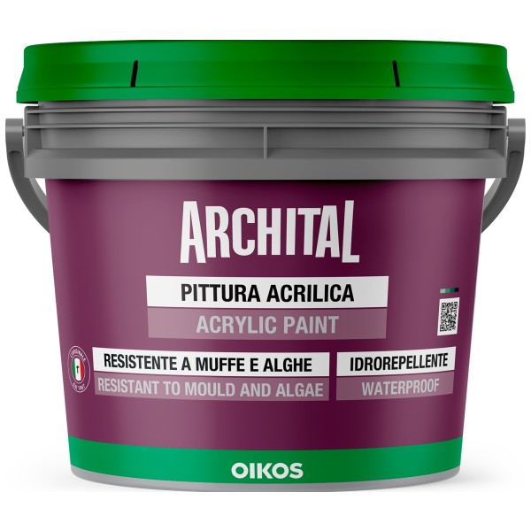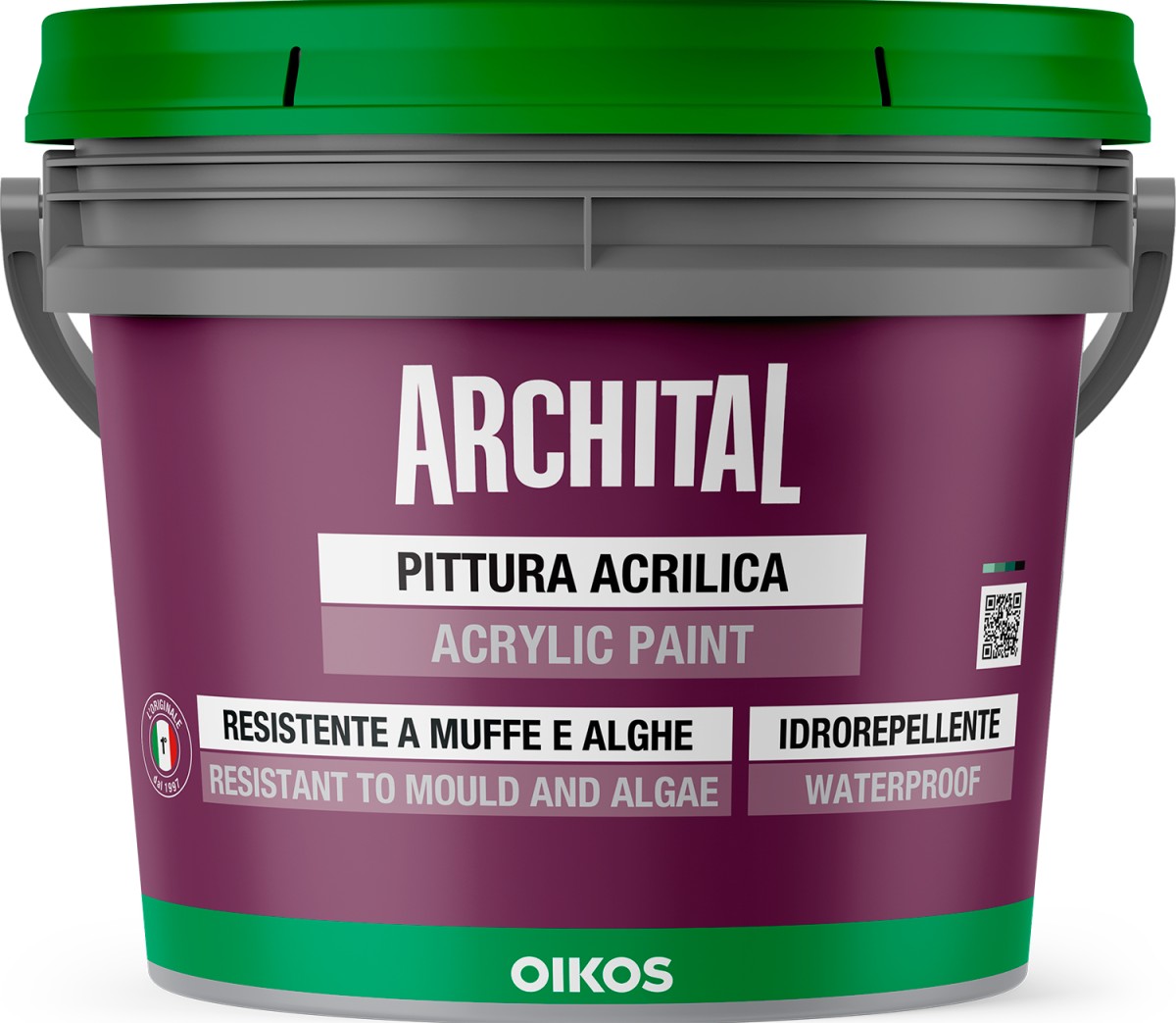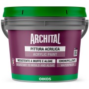 ARCHITAL компании OIKOS – это специальная, отлично моющаяся водоэмульсионная краска для стен на акриловой основе, предупреждающая образование плесени. Её особая формула сочетает устойчивость кварца и качества акриловых смол, а именно: устойчивость к морозам и оттепелям, сопротивление влиянию УФ лучей и кислот, высокую паропроницаемость, водоотталкиваемость, отличную покрывающую способность, а также противодействие образованию плесени и водорослей. Доступный во множестве цветовых вариантов, ARCHITAL придаёт стенам гладкий матовый эффект, особенно подходит для защиты и декора престижных построек, в том числе находящихся в суровых климатических условиях. Для большего предоставращения плесени и мха, рекомендуется добавление дезинфицирующего раствора STERYLPLUS. Со слабым запахом, негорючий, безопасен для человека и окружающей среды.